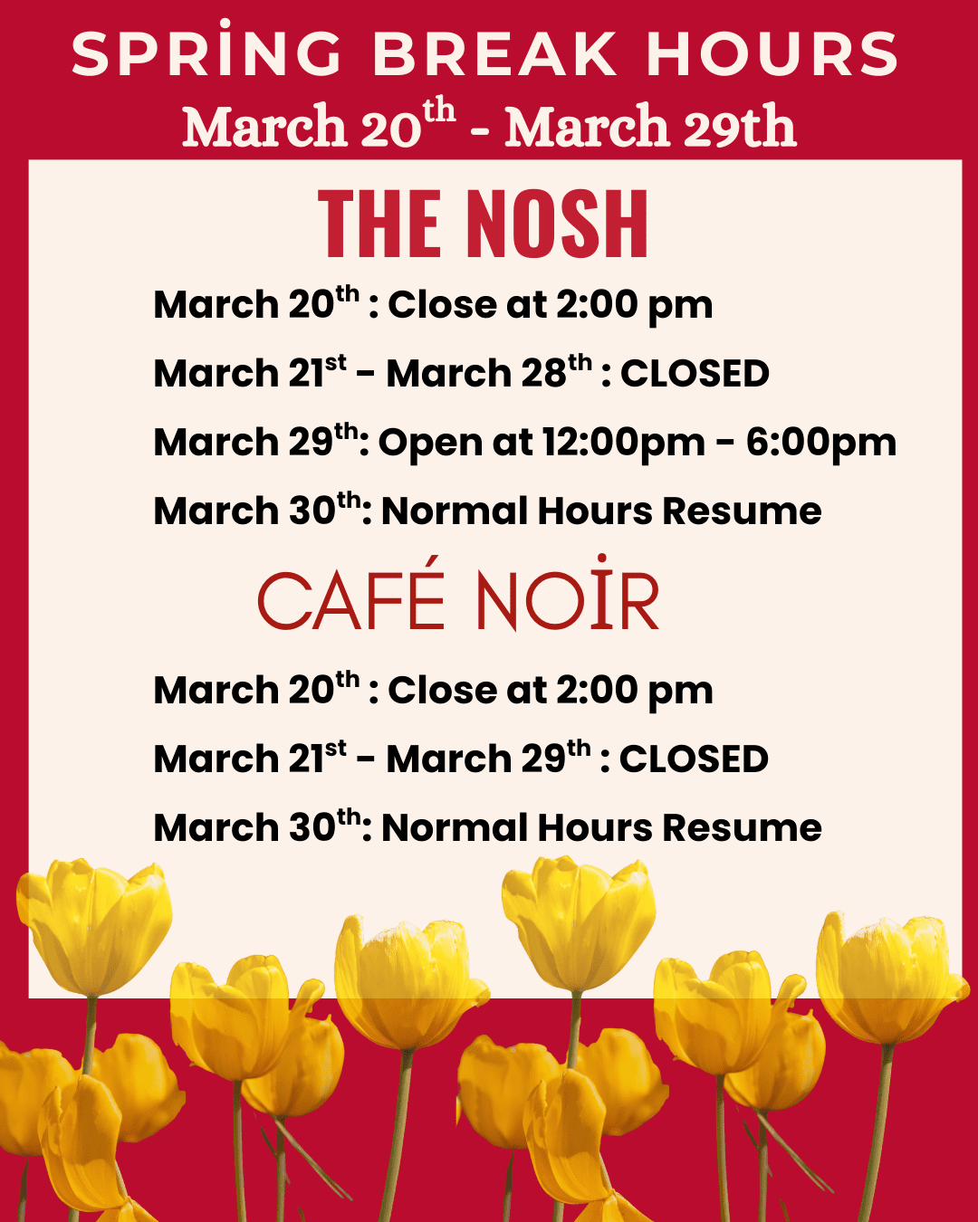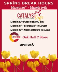 Spring Break Hours 2026 Post Date: March 18, 2026 Categories: News Spring Break Hours 2026 March 20th – March 29th
